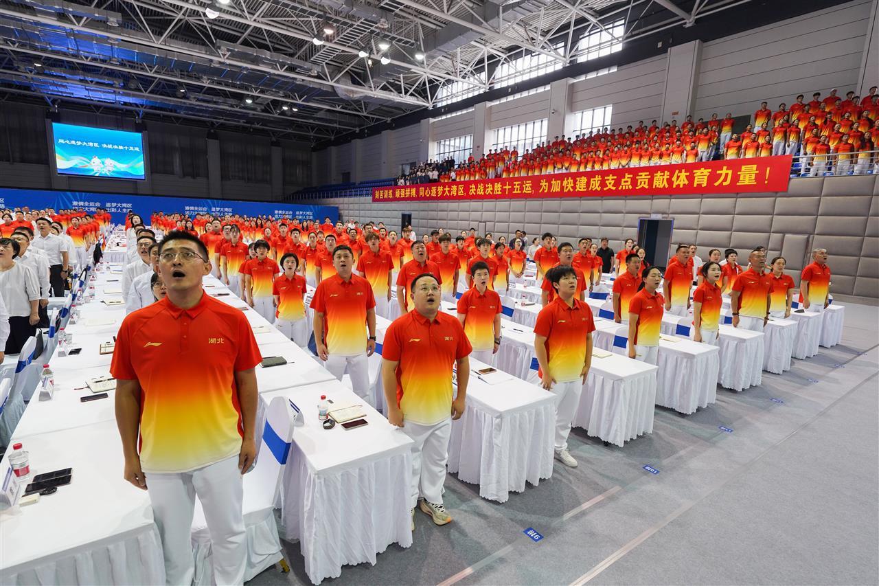 10月10日上午,第十五屆全國運動會湖北省體育代表團成立暨出征誓師大會在武漢舉行。由王宗源、鄭欽文、汪周雨、昌雅妮、孫佳俊等奧運冠軍領銜的604名湖北體育健兒,將在本屆全運會上力爭佳績,捍衛(wèi)湖北榮光。
