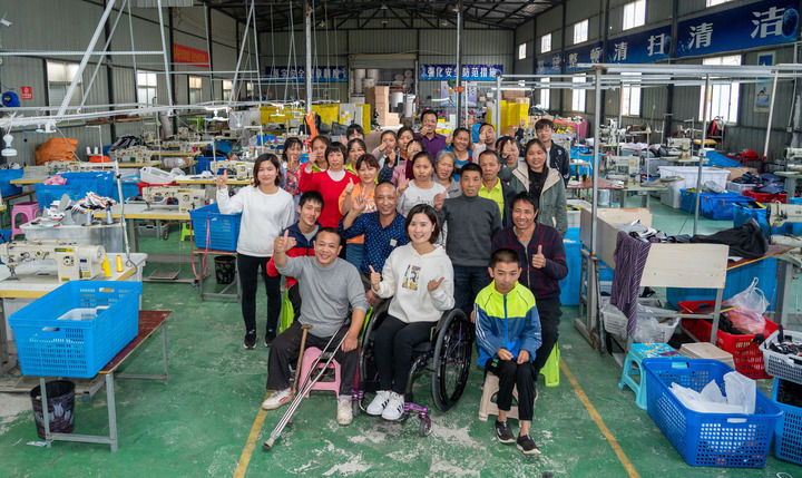 2020年10月13日,在湖南省邵陽市城步縣湖南七七科技股份有限公司生產車間,楊淑亭(前排中)與工友合影。新華社記者 才揚 攝