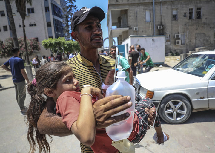 2025年7月13日,在加沙城一所醫院,一名男子懷抱在以軍空襲中受傷的女孩。新華社發(馬哈茂德·扎基攝)