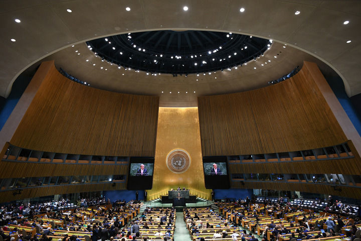 這是2025年9月22日在位于紐約的聯合國總部拍攝的聯合國大會紀念北京世婦會30周年高級別會議現場。新華社記者 李睿 攝