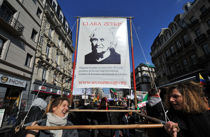 2010年3月6日,在比利時首都布魯塞爾,婦女代表抬著著名女政治活動家、三八國際婦女節的倡導者克拉拉·蔡特金的畫像參加慶祝三八國際勞動婦女節游行。新華社記者 武巍 攝