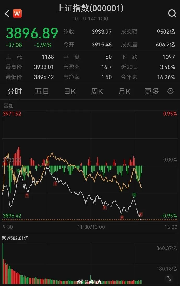 10月10日下午, 滬指失守3900點 ,日內跌超0.9%。