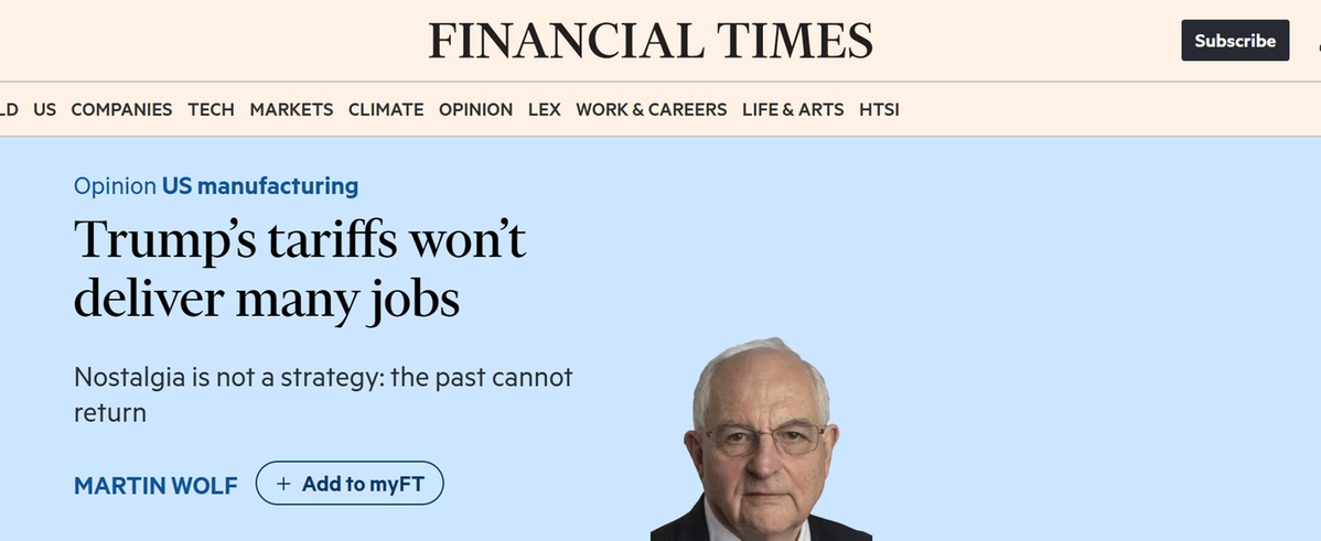 中國日?qǐng)?bào)網(wǎng)10月10日電 英國《金融時(shí)報(bào)》副總編及首席經(jīng)濟(jì)評(píng)論員馬丁·沃爾夫(Martin Wolf)8日發(fā)表評(píng)論文章稱,事實(shí)表明,特朗普政府推行的貿(mào)易保護(hù)主義政策,并未兌現(xiàn)其對(duì)選民所作的核心承諾——為美國創(chuàng)造大量制造業(yè)就業(yè)崗位,尤其是面向那些曾經(jīng)依賴傳統(tǒng)工業(yè)、如今卻面臨地區(qū)經(jīng)濟(jì)衰落困境的工人群體。他進(jìn)一步指出,這一承諾本質(zhì)上是空洞的,其政策實(shí)質(zhì)是為政府自身及其背后的富豪階層牟取利益。