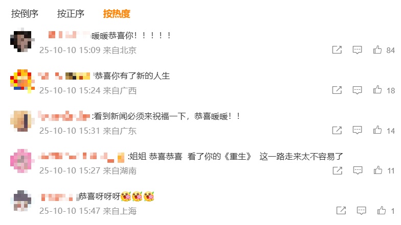 10月10日,王暖暖在社交媒體平臺發布一條記錄自己與孩子幸福瞬間的視頻,配文 “鄧布利多你說的對,愛是最偉大的魔法”,該視頻評論區已被網友的 “恭喜” 留言刷屏。