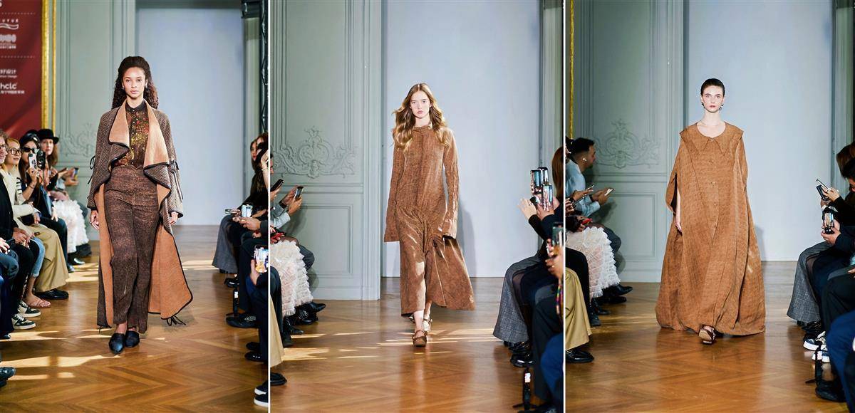 “時況|ERA KUANG”香云紗系列作品亮相中法時裝周第三屆“中國服裝好設計”聯合發布秀現場。武漢設計工程學院供圖