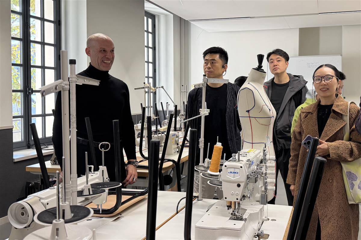 武漢設計工程學院時尚設計學院院長況敏(右一)在法國國際時裝學院就教學實驗條件進行交流。武漢設計工程學院供圖