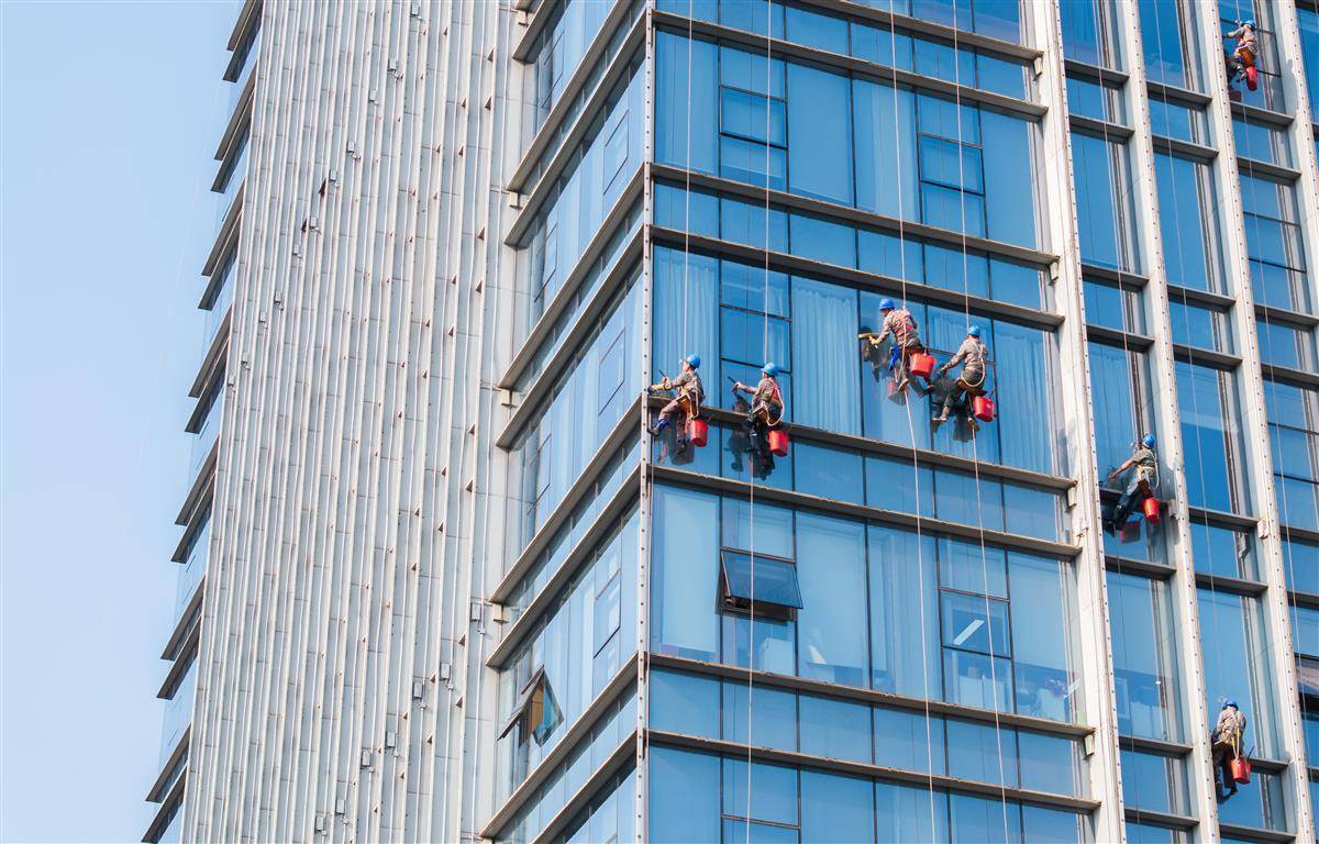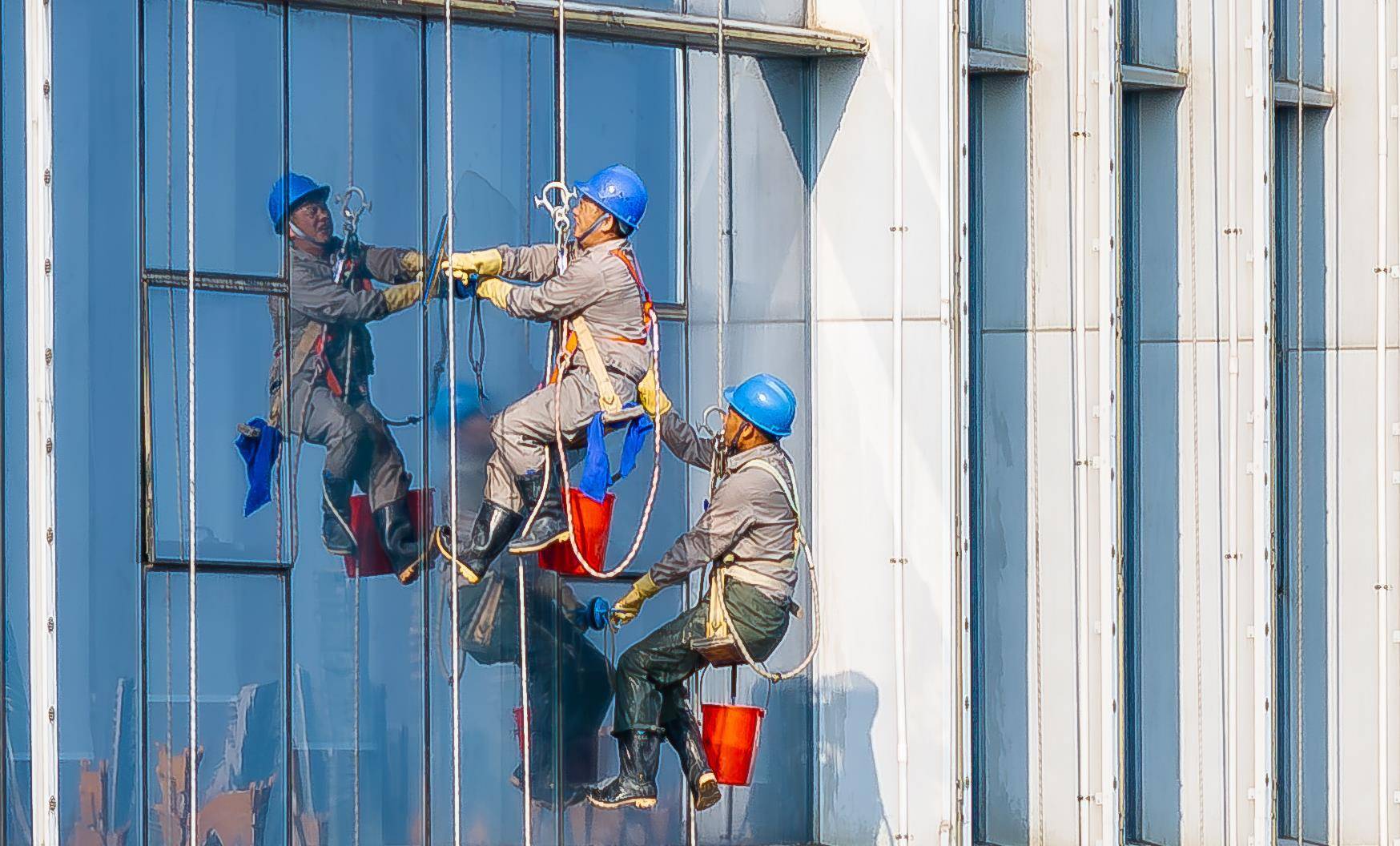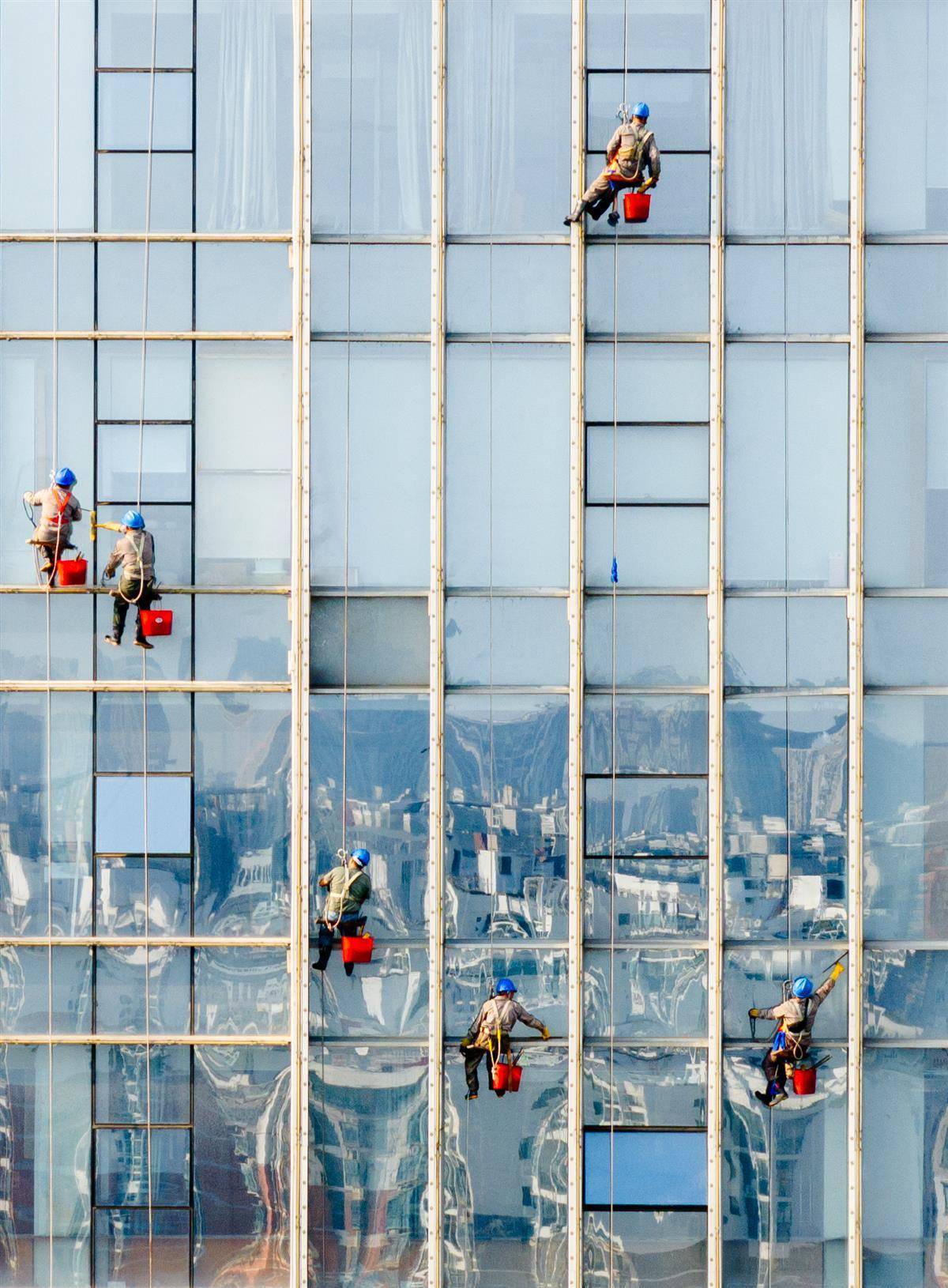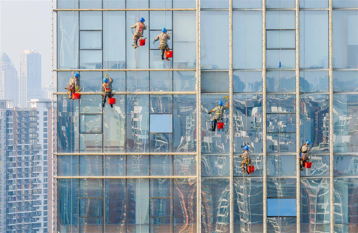 10月10日,武漢徐東大街,幾名“蜘蛛人”在數十米高的大樓外墻清洗玻璃。他們的身后是飛翔的鴿子,腳下是滾滾車流。他們的身影和玻璃幕墻上城市的倒影融為一體,成為扮靚城市的一道最美風景線。(湖北日報全媒記者 柯皓 攝)