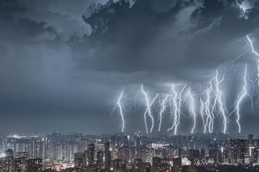 9日晚武漢上空閃電,延時攝影合成圖。圖源:湖北氣象