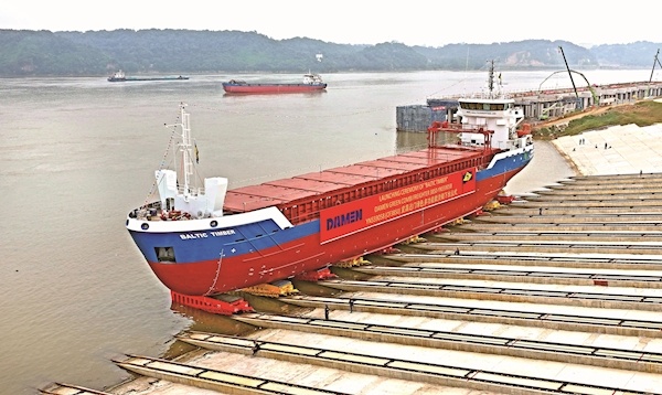 10月10日,由達(dá)門船舶新建造的長89.7米、寬12.5米,載重3800噸的多功能貨船,通過國內(nèi)首創(chuàng)的集成式船舶反拉滑道下水系統(tǒng),在經(jīng)過半小時(shí)的平穩(wěn)下放后順利入水。這套被稱為“晟航”的系統(tǒng)由中鐵科工集團(tuán)研制,能夠幫助船舶像坐電梯一樣“翻堤越壩”完成下水作業(yè)。當(dāng)天,宜昌產(chǎn)投(宜都)綠色智能船舶產(chǎn)業(yè)園開園暨宜昌達(dá)門船舶有限公司新址投產(chǎn)儀式在宜都舉行。楚天都市報(bào)極目新聞?dòng)浾邉⑹锼?通訊員朱燦義 黎文來攝影報(bào)道