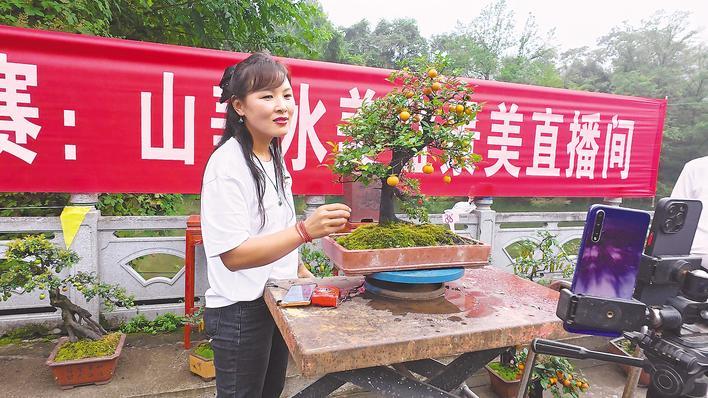 村民正在參加盆景網絡直播銷售比賽。(湖北日報通訊員 田芳 攝)