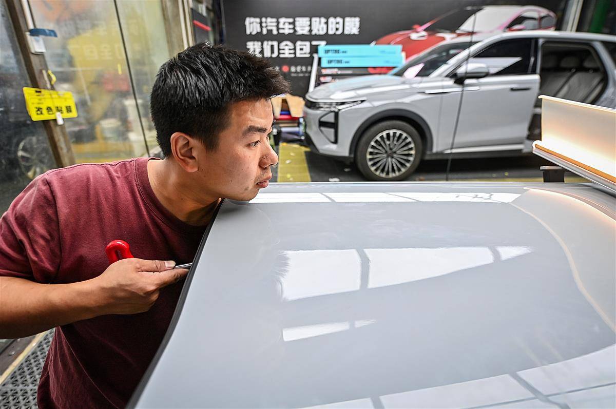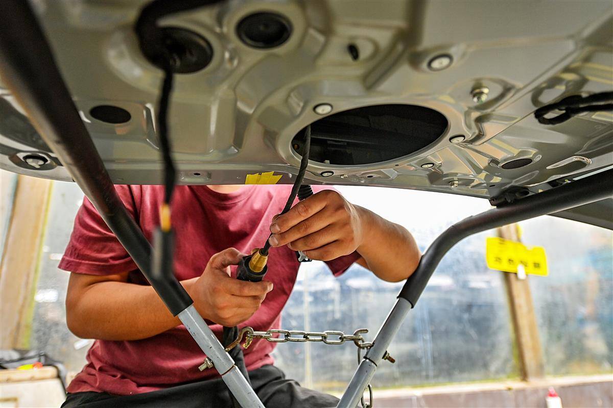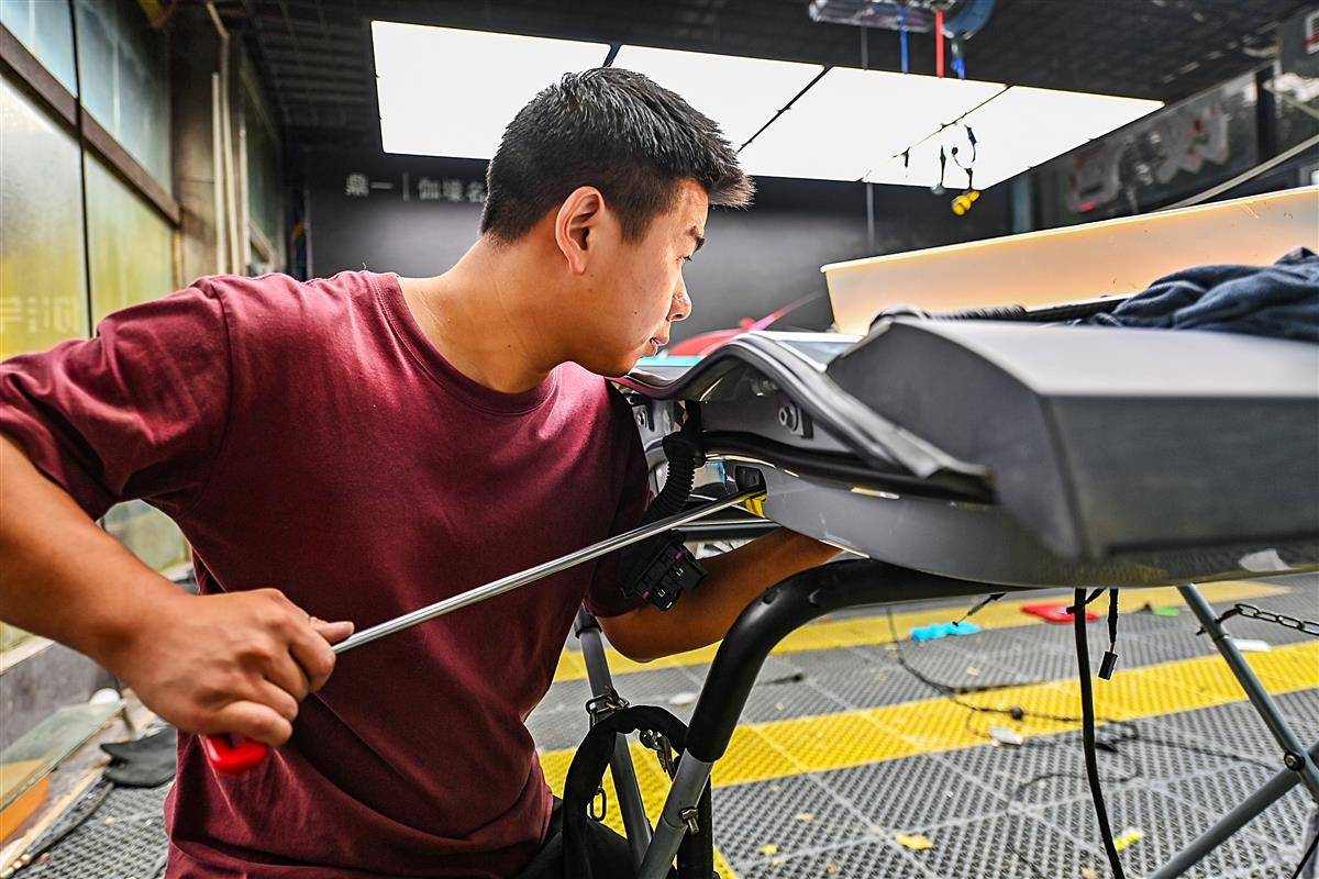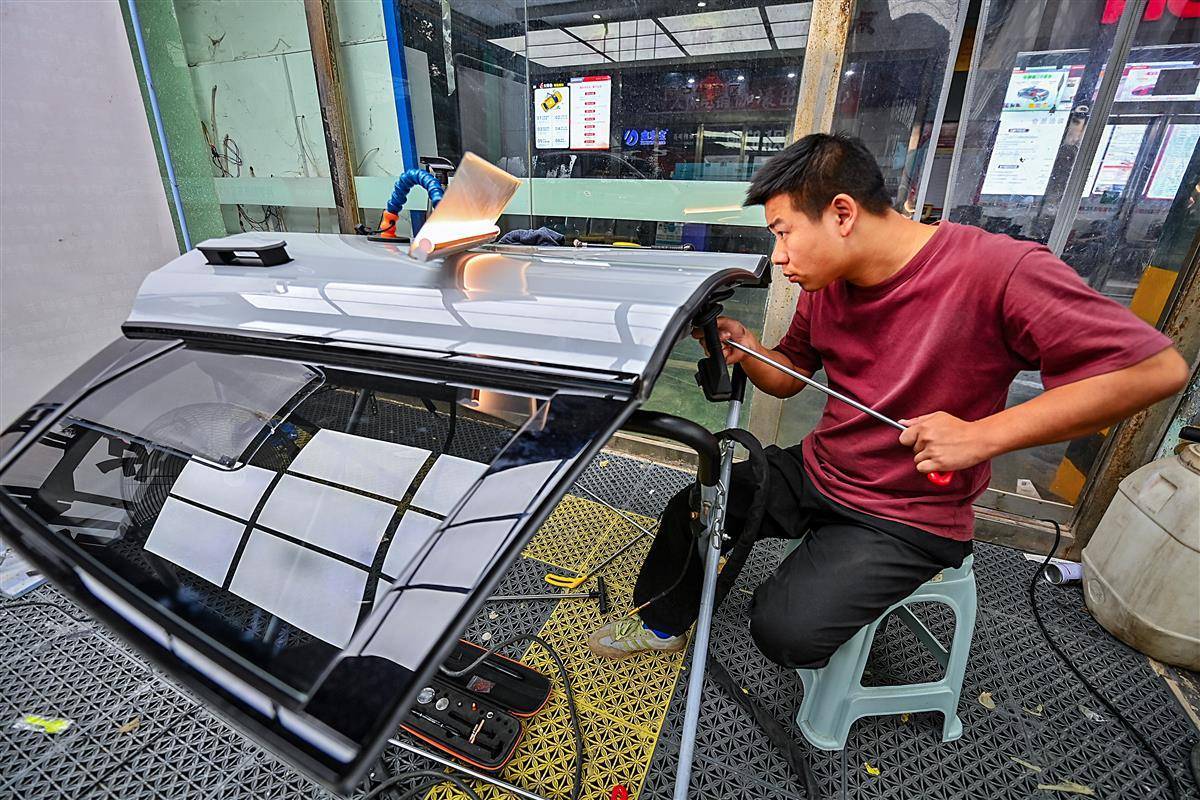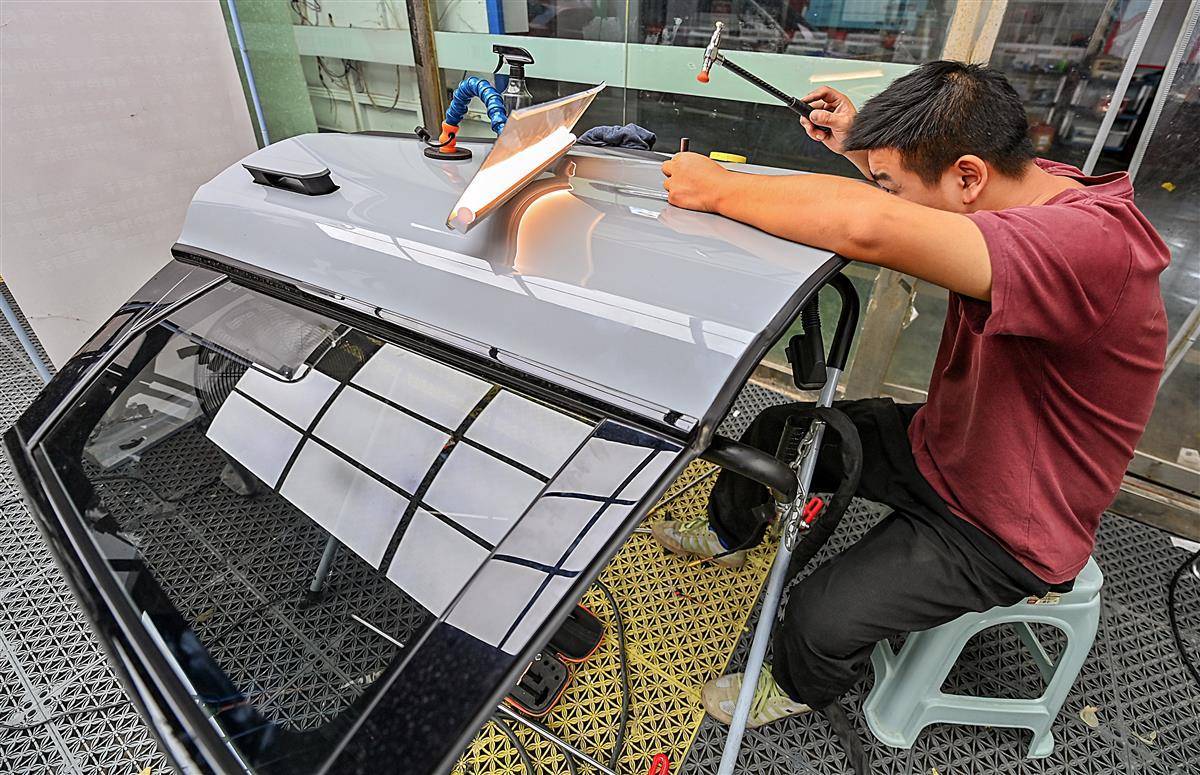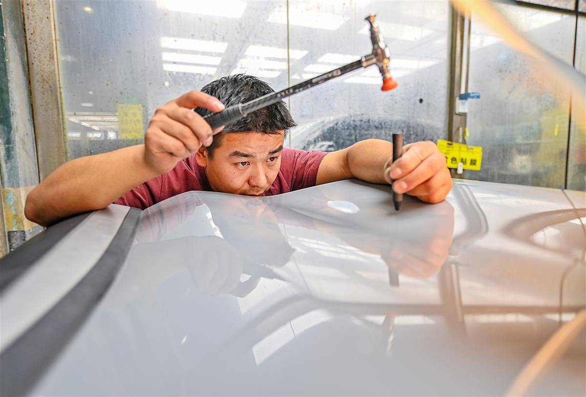 10月10日,武漢仁和路某汽車修理廠車間里,葉師傅正在進行汽車凹陷修復工作。汽車凹陷修復是一種基于光學、物理及力學原理的無損修復技術,通過杠桿原理在不破壞原車漆的前提下恢復車身凹陷,主要適用于未掉漆的銳角、鈍角凹陷及冰雹坑。葉師傅稱,相較于傳統鈑金修復需打磨車漆并經歷多道噴涂工序,凹陷修復技術省略了噴漆環節。目前武漢已有60多家汽車修理廠開展汽車凹陷修復業務。(湖北日報全媒記者 朱熙勇 攝)