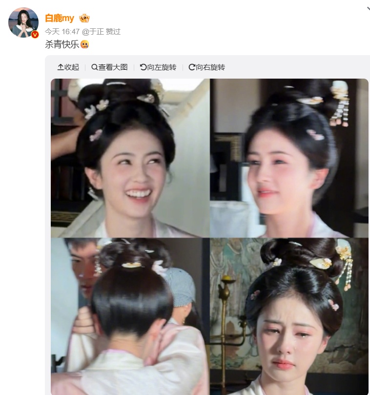 10日下午,白鹿個人社媒分享四張照片,并發文:殺青快樂。