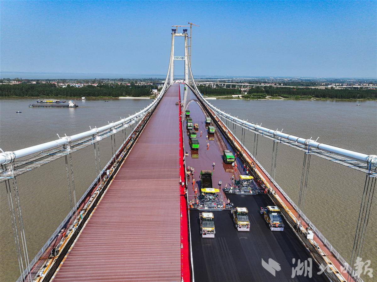 湖北日報訊 (記者戴輝、通訊員李雙、張勇輝)10月10日,由湖北交投集團投資建設的雙柳長江大橋主橋鋼橋面完成左幅環氧瀝青下層鋪裝。單日鋪裝面積首次突破2.9萬平方米,約69個標準籃球場占地面積,超越深中通道伶仃洋大橋、黃茅海跨海通道黃茅海大橋,創造了環氧瀝青鋪裝單日鋪裝面積新的世界紀錄。