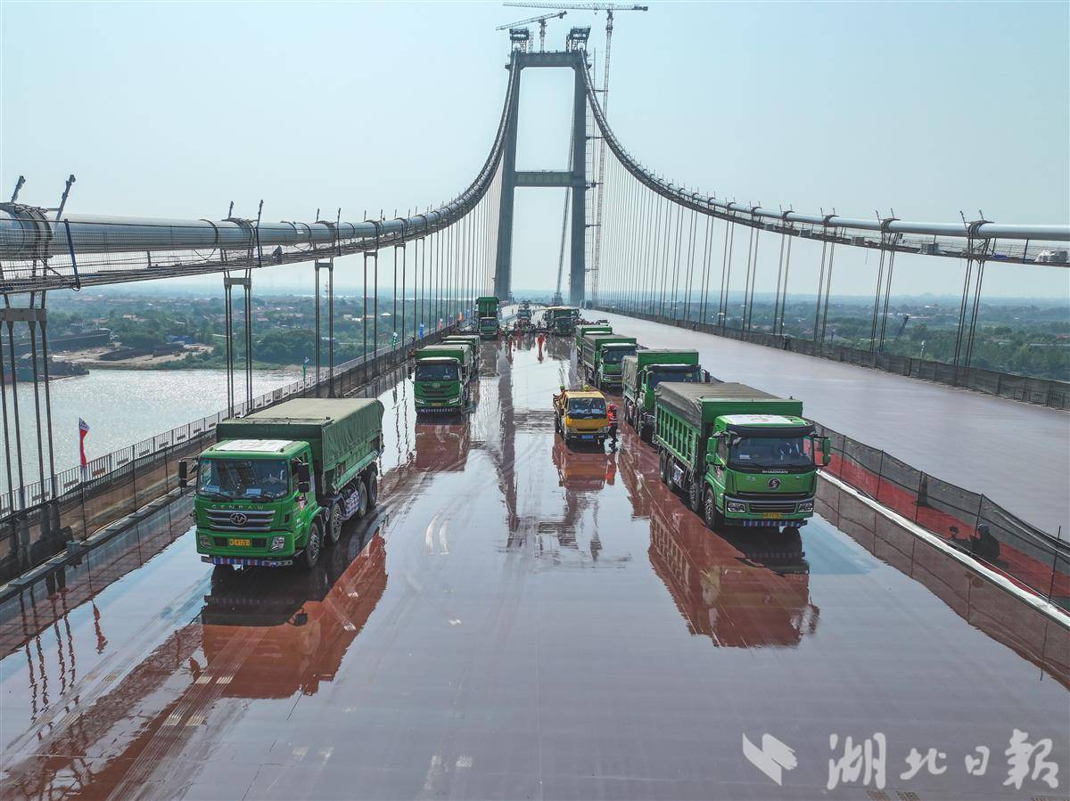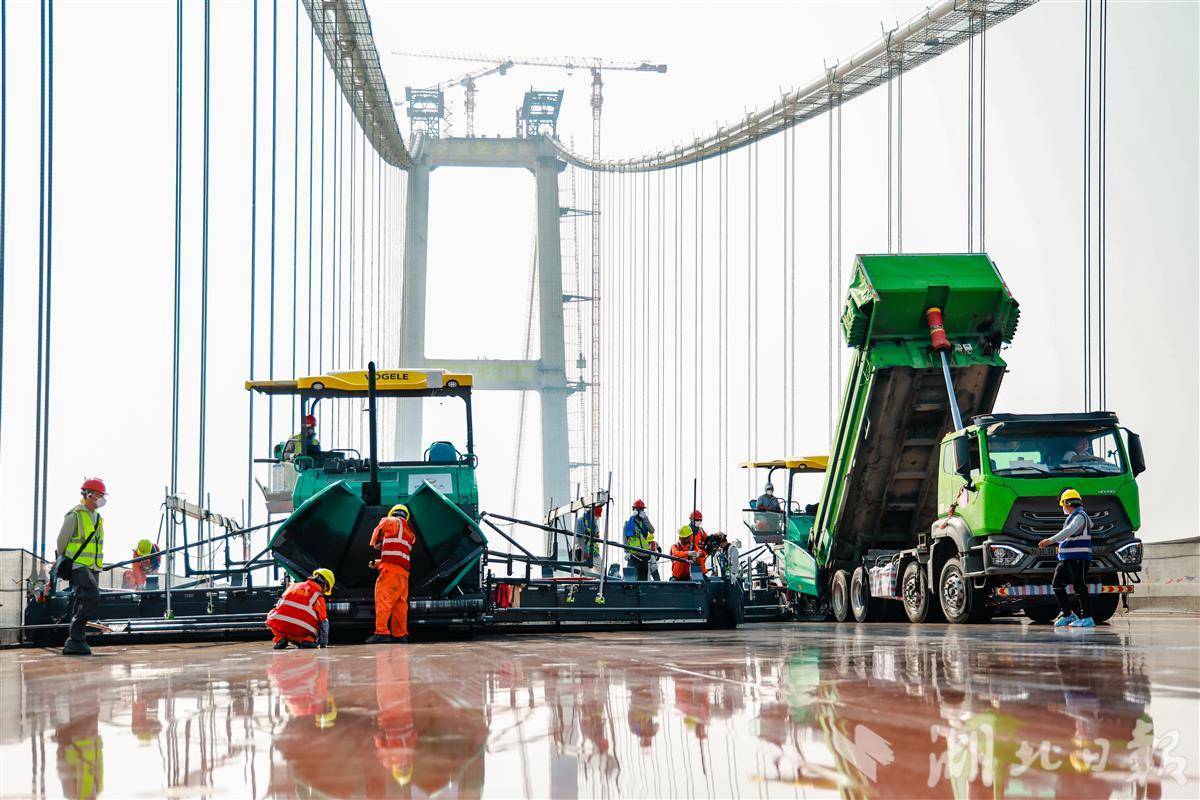 從武漢市新洲區駛上剛剛合龍的大橋橋面,噴灑上防水粘接層的橋面如同鏡面,五六臺攤鋪機、壓路機輪番碾壓冒著熱氣的黑色混凝土,將瀝青和鋼箱梁深深“吻”在一起。“這是添加了環氧樹脂的環氧瀝青混凝土。”一旁的湖北交投雙柳橋公司副總經理付永樂介紹,當天投入設備40臺套,300余名建設者晝夜不息作業,確保施工進度和環氧瀝青的鋪裝質量達標。