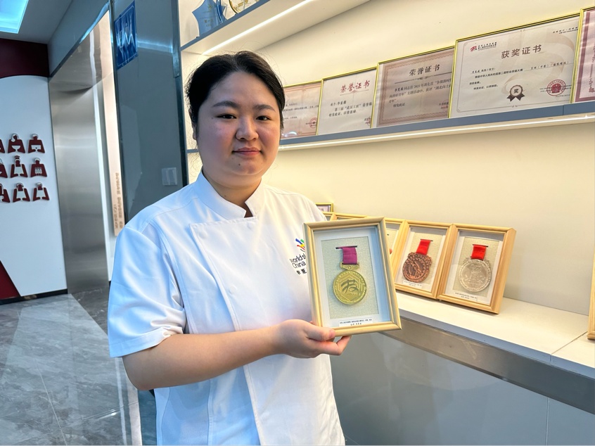 兩年前,年僅24歲的李夏薇在這一賽事上斬獲烹飪中餐賽項(xiàng)金牌(第一名)。在這之前,李夏薇一路過(guò)關(guān)斬將,先后獲得第46屆世界技能大賽烹飪(西餐)項(xiàng)目武漢市選拔賽第一名和湖北省總決賽第一名,最終入選第46屆世界技能大賽烹飪(西餐)項(xiàng)目中國(guó)集訓(xùn)隊(duì)隊(duì)員和第47屆世界技能大賽烹飪(西餐)項(xiàng)目湖北省集訓(xùn)隊(duì)教練。與此同時(shí),她被人社部授予“中華人民共和國(guó)第一屆職業(yè)技能大賽優(yōu)秀選手”,被學(xué)校破格留校,擔(dān)任烹飪專業(yè)專任教師。
