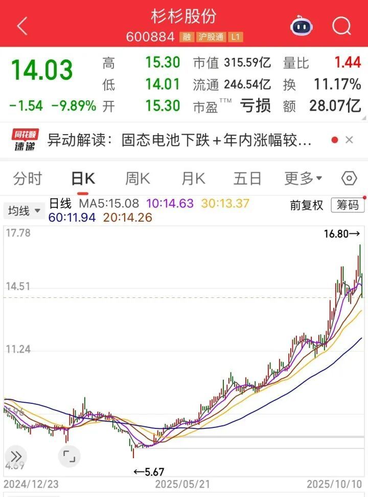 國慶長假后的首個交易日,杉杉股份跌2.08%。10月10日,受固態電池板塊整體調整等因素的影響,股價大跌9.89%,收盤報價14.03元/股,當前市值316億元。