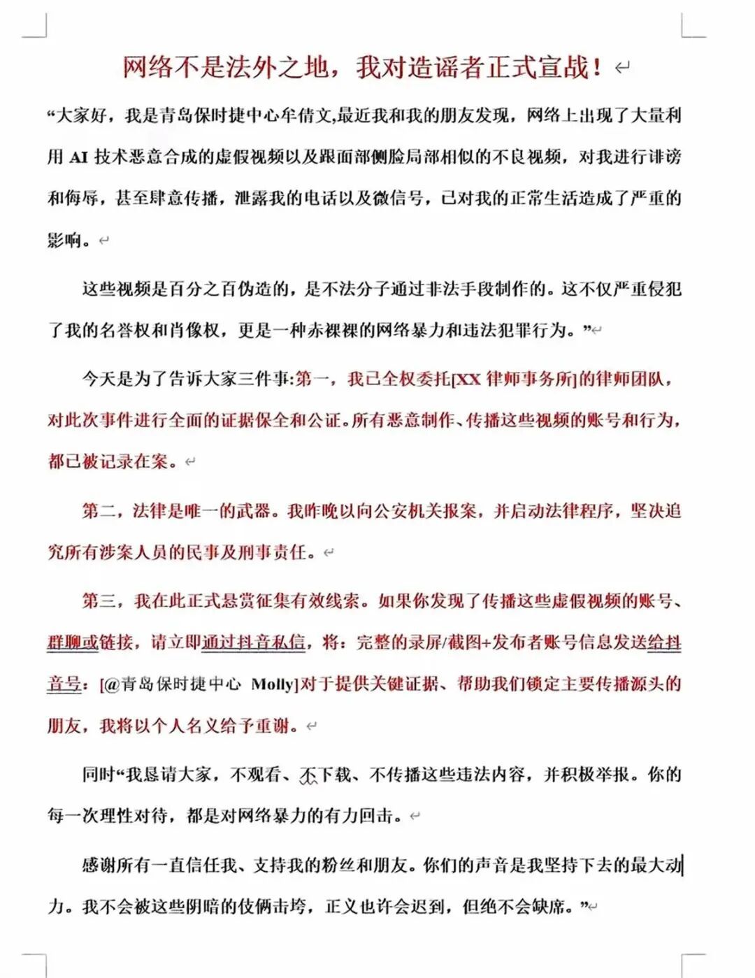 同時,牟女士還正式懸賞征集有效線索,對于提供關鍵證據、幫助她鎖定主要傳播源頭的,她將以個人名義給予重謝。