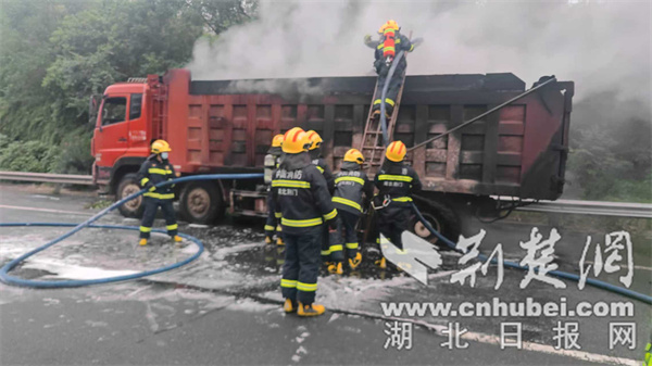 此時,貨車尾部火勢已蔓延至半幅車廂,高溫炙烤著地面,空氣中彌漫著刺鼻的焦糊味,后方車輛已形成近500米的擁堵帶。
