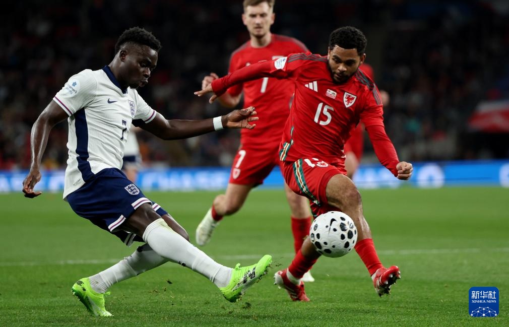 10月9日,英格蘭隊球員薩卡(左)與威爾士隊球員達席爾瓦拼搶。