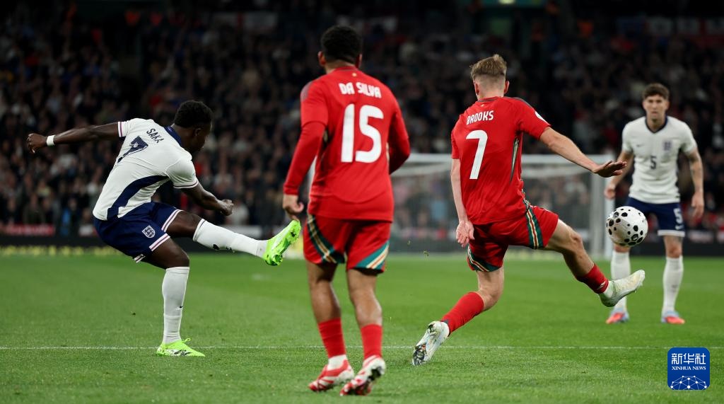 10月9日,英格蘭隊球員薩卡(左一)在比賽中射門得分。