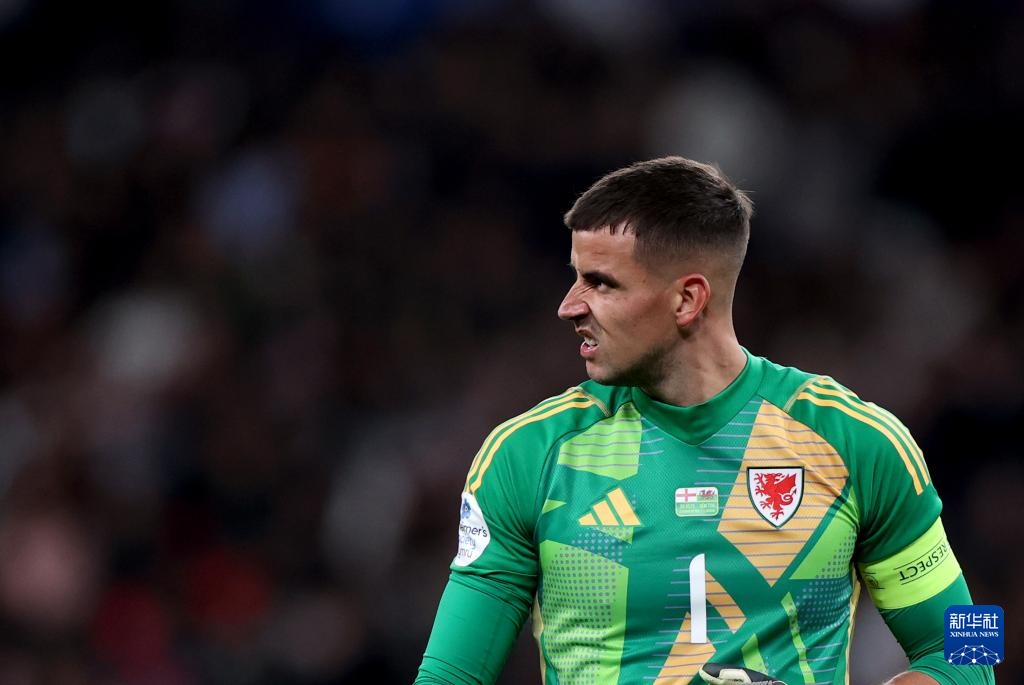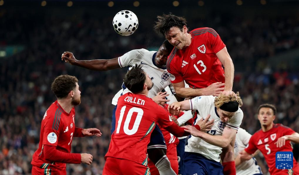 10月9日,英格蘭隊球員蓋伊(上左)與威爾士隊球員摩爾(上右)爭頂。