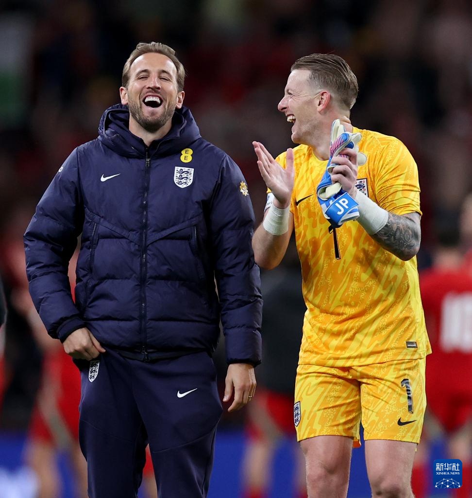 10月9日,英格蘭隊球員凱恩(左)與門將皮克福德在比賽后交談。