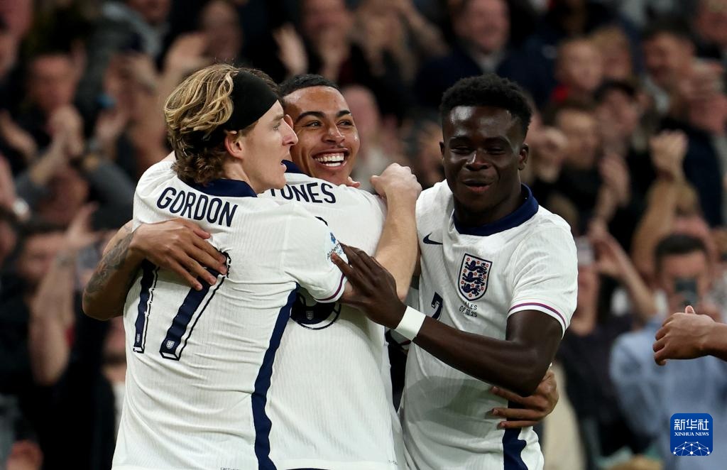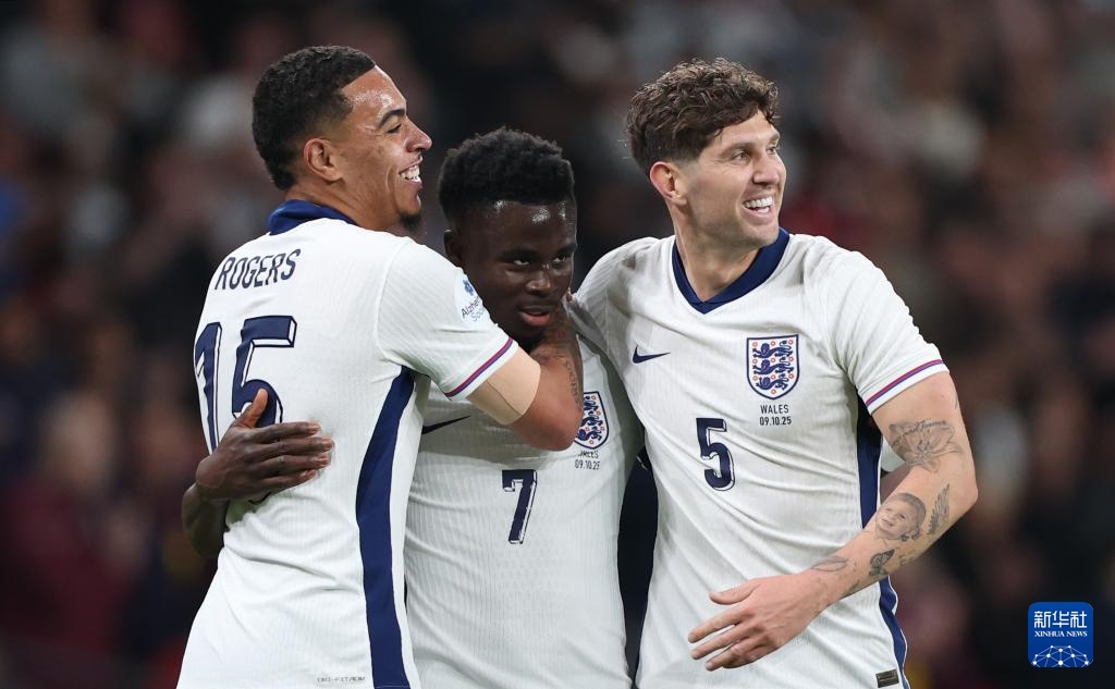10月9日,英格蘭隊球員薩卡(中)進球后與隊友慶祝。