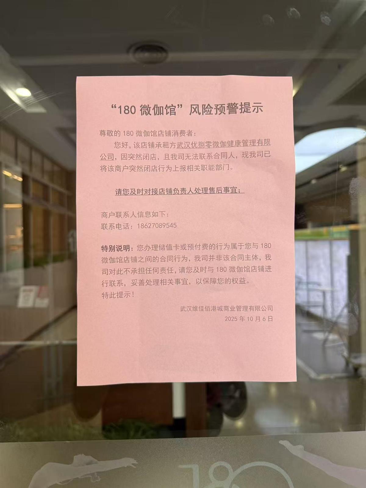 “剛看到群里的告別信,還沒反應過來,群就沒了。”10月7日,多位市民向極目新聞熱線反映,2013年就在武漢開店的邁索爾優+瑜伽,于10月5日23點45分左右,在各店會員群突然發出一封“道歉與告別信”,宣布自10月6日起,該品牌在武漢的所有場館全面停止運營。隨后火速解散了所有會員群,這場毫無征兆的“告別”,讓會員們面臨充值卡余額無處可退的困境。