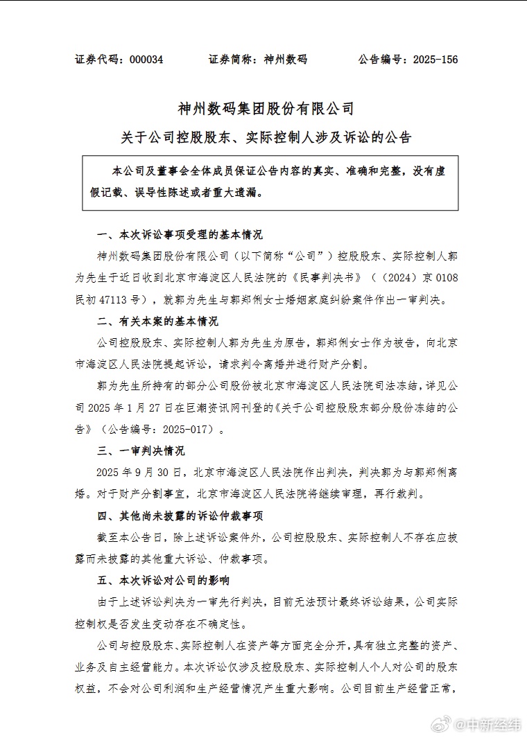 10月10日,神州數碼公告,控股股東、實際控制人郭為涉及的婚姻家庭糾紛案件于2025年9月30日作出一審判決,判決其與郭鄭俐離婚。而對于財產分割事宜,法院將繼續審理,再行裁判。