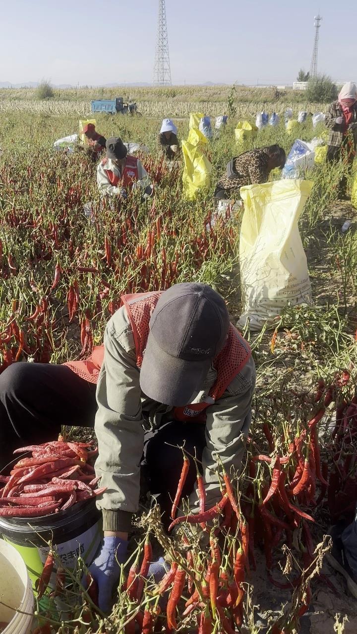 小龐表示,自己是內(nèi)蒙古巴彥淖爾本地人,自己家也種辣椒,從事勞務類工作已有兩年。當?shù)乩苯窂?月中旬就開始采摘,一直持續(xù)到11月上旬,7月采摘的是鮮辣椒,也就是青辣椒,9月開始采摘醬辣椒,也就是紅辣椒,主要用來做辣椒醬。