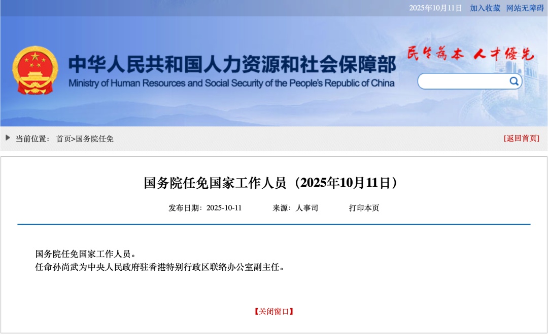 據人力資源和社會保障部網站10月11日消息,國務院任免國家工作人員,任命孫尚武為中央人民政府駐香港特別行政區聯絡辦公室副主任。