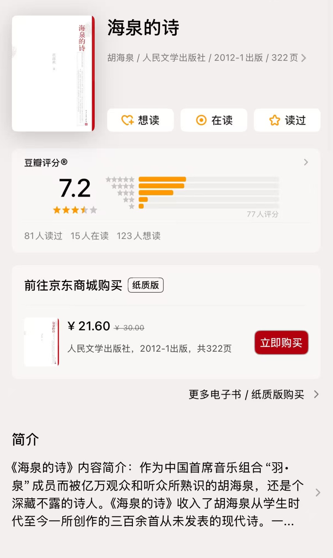胡海泉曾出版詩集《海泉的詩》,該作品收入了胡海泉從學生時代至今一所創作的三百余首從未發表的現代詩。據介紹,該作品將一個少年的煩惱與憂愁、對生死的哲學思辨、對朦朧愛情的呢喃自語、對詩的忘我激情與崇拜,都鮮活地跳躍在字里行間。
