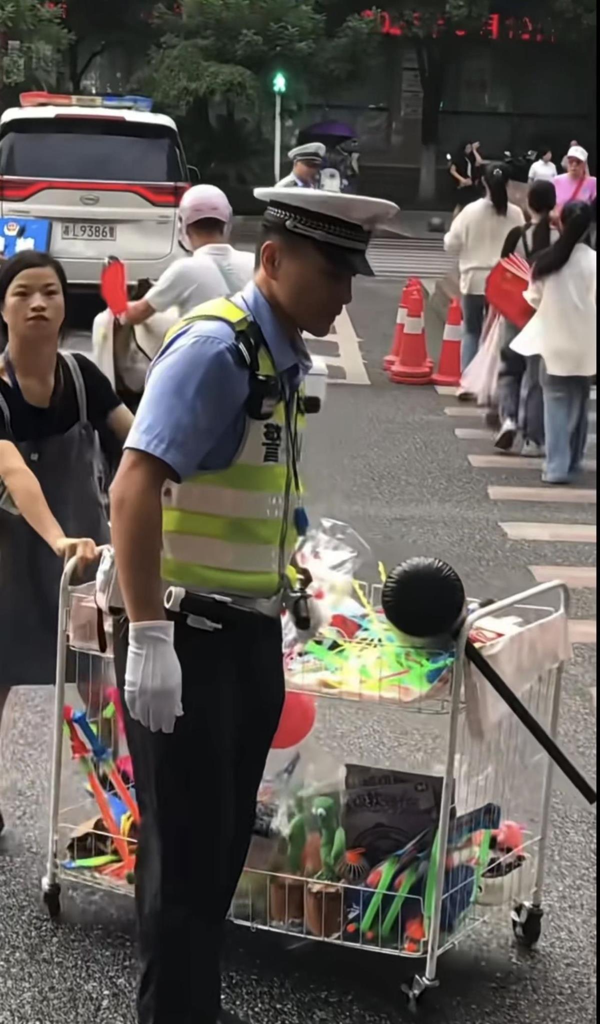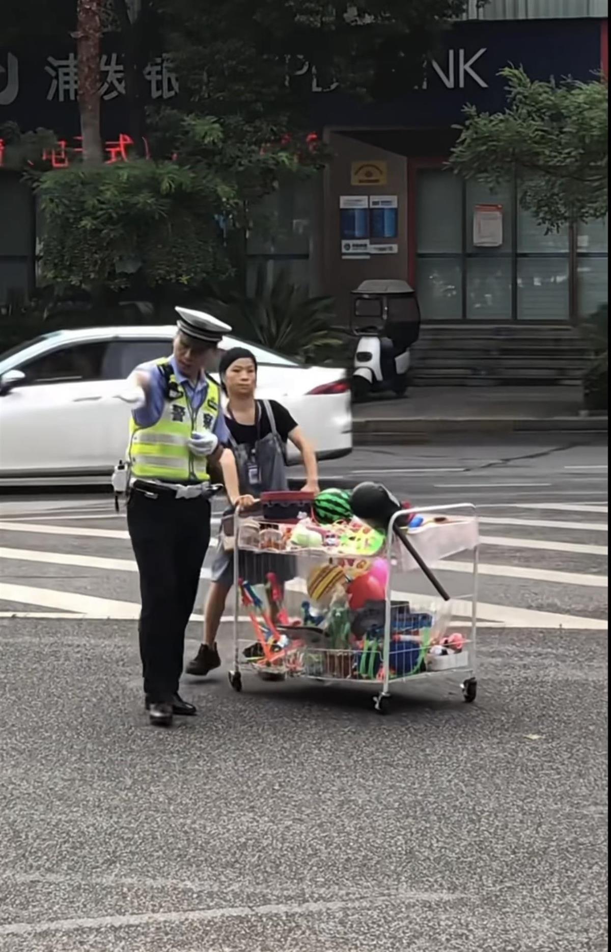 10日17時許,視頻拍攝者格先生向極目新聞記者介紹,這一幕發生在10月1日上午8時左右的早高峰時段。在郴州市青年大道與五嶺大道交會路口,車流密集,一位腿腳不便的殘疾女士正推著擺攤推車,在馬路中間艱難前行。正在此時,郴州市公安局交警支隊一大隊民警劉建華發現這一情況,立即快步上前,舉起左手打出標準手勢引導兩側車輛減速,同時吹響口哨提醒注意,迅速為攤主筑起一道“移動安全屏障”。
