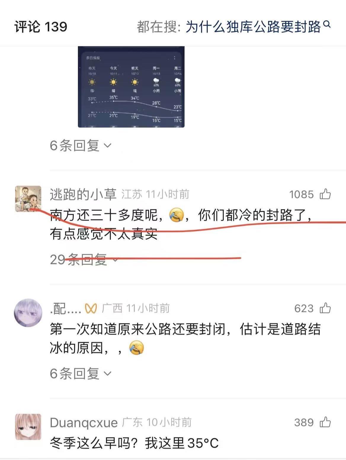 南方的網友們表示驚詫,江蘇微信網友“逃跑的小草”說:“南方還三十攝氏度呢,你們都冷得封路了,有點感覺不太真實。”廣東網友“霞”說:“廣東還在吹空調。”
