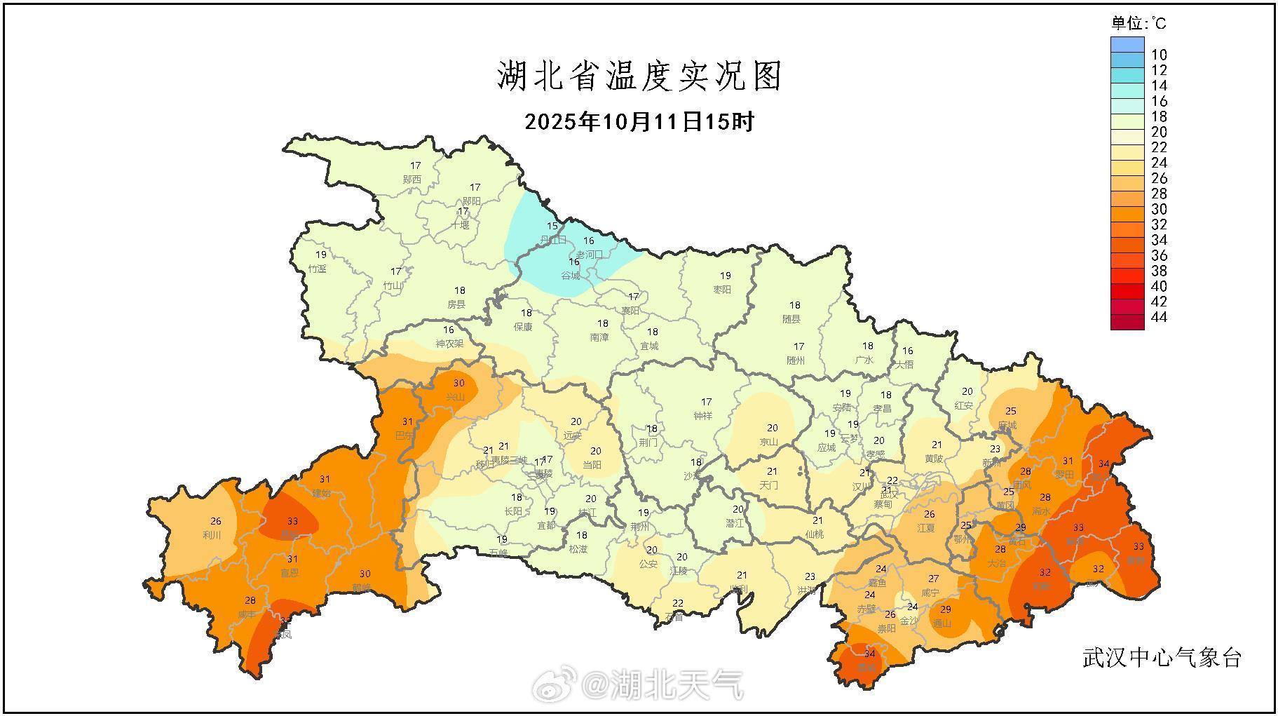荊楚大地,除恩施和鄂東東部兩個角落以外,湖北大部地區已降溫:昨日(10日)十堰、襄陽一帶最高氣溫僅14℃-19℃,鄂東南地區卻高達35℃-38℃。今日下午3時,恩施和鄂東東部氣溫為24℃-34℃,其他地區15℃-23℃。相較昨天(10日)同一時次,東部地區及宜昌局部普遍降溫5℃-11℃,其他地區1℃-4℃,神農架和監利降幅超13℃。
