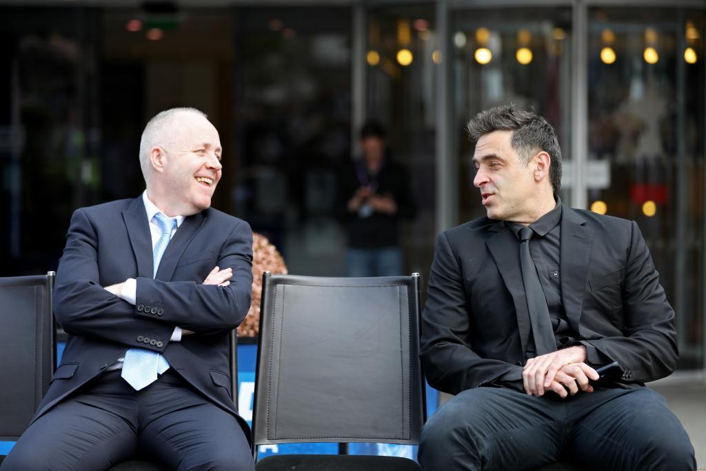 2022年4月15日,奧沙利文(右)與蘇格蘭選手約翰·希金斯共同出席活動(dòng)。新華社記者 李穎 攝
