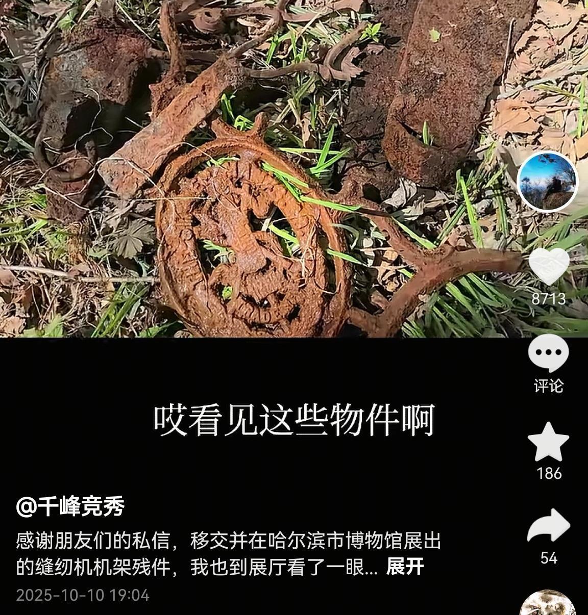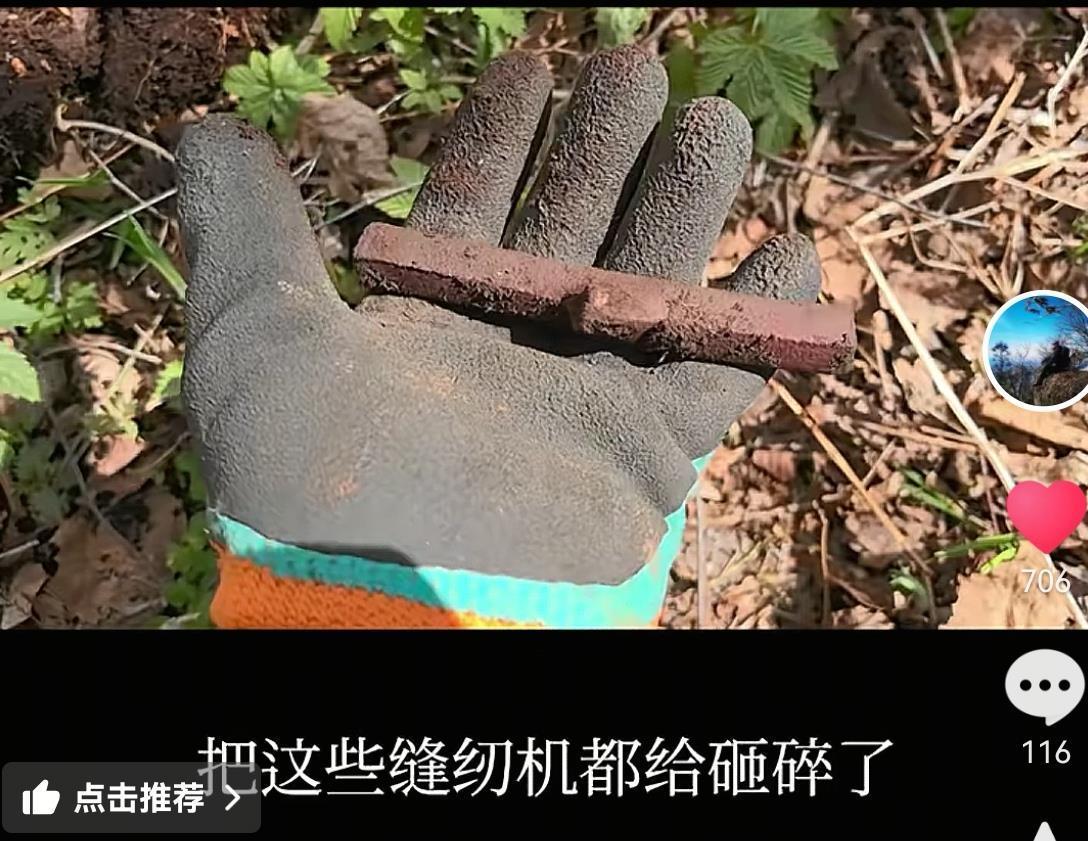 10月10日晚,網(wǎng)友@千峰競秀發(fā)視頻稱,他徒步10多公里將在深山密林發(fā)現(xiàn)的東北抗聯(lián)縫紉機殘件背下山,感謝朋友們的私信,這些縫紉機殘件已移交給哈爾濱市博物館展出。