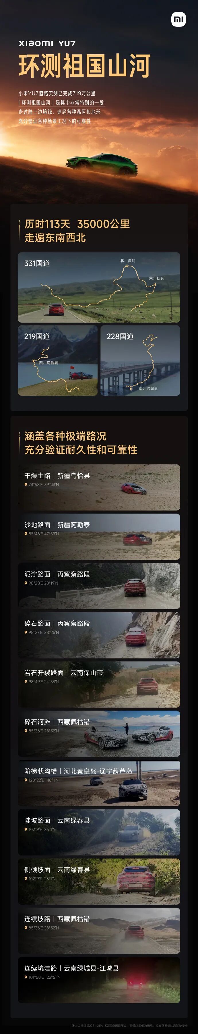 小米汽車7月24日宣布,小米 YU7 路測團隊,剛剛完成了一段特殊的路測:貫穿 G228、G219、G331 三條國道,環繞祖國山河,覆蓋各種溫區、地形和復雜路況。