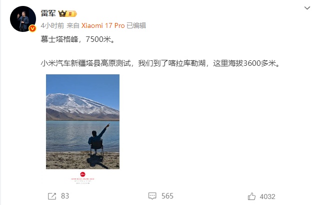 10月11日,小米創辦人,董事長兼CEO雷軍發文表示,小米的20多名工程師正在新疆塔縣、帕米爾高原進行小米汽車的高原測試。