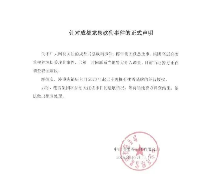 10月11日,中山市櫻雪集團(tuán)有限公司針對成都龍泉砍狗事件正式聲明: