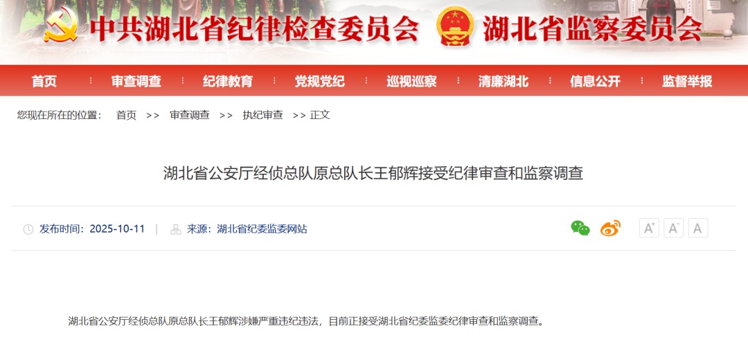 湖北省公安廳經(jīng)偵總隊原總隊長王郁輝涉嫌嚴重違紀違法,目前正接受湖北省紀委監(jiān)委紀律審查和監(jiān)察調(diào)查。