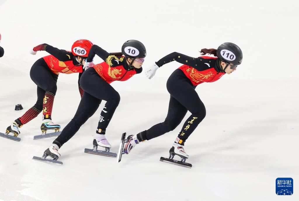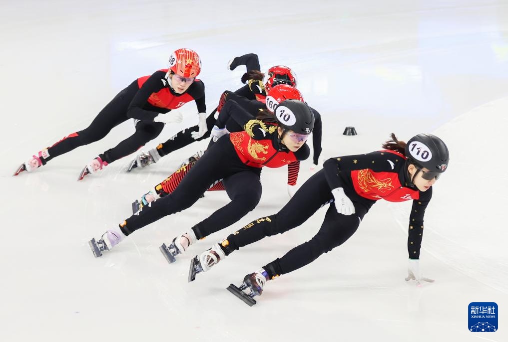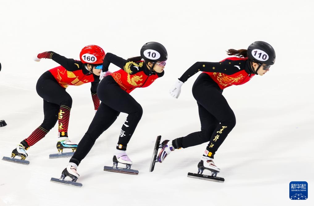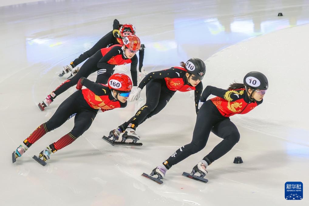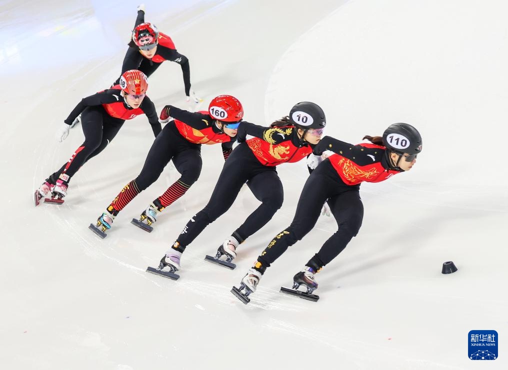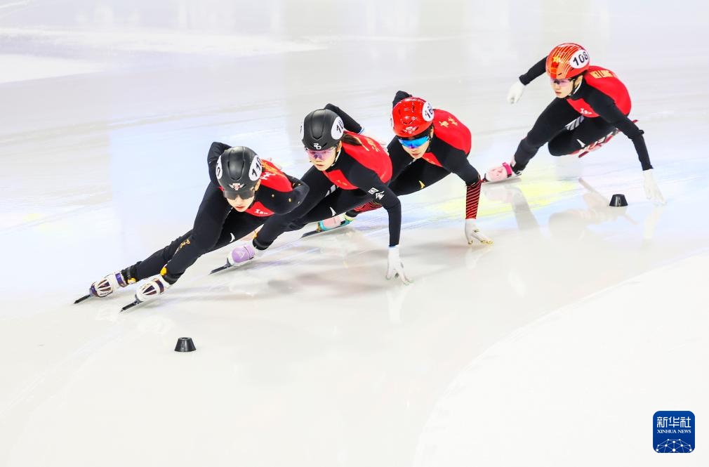 10月11日,黑龍江省冰上訓(xùn)練中心選手張延(左一)在甲組女子1000米決賽中。最終,她獲得冠軍。