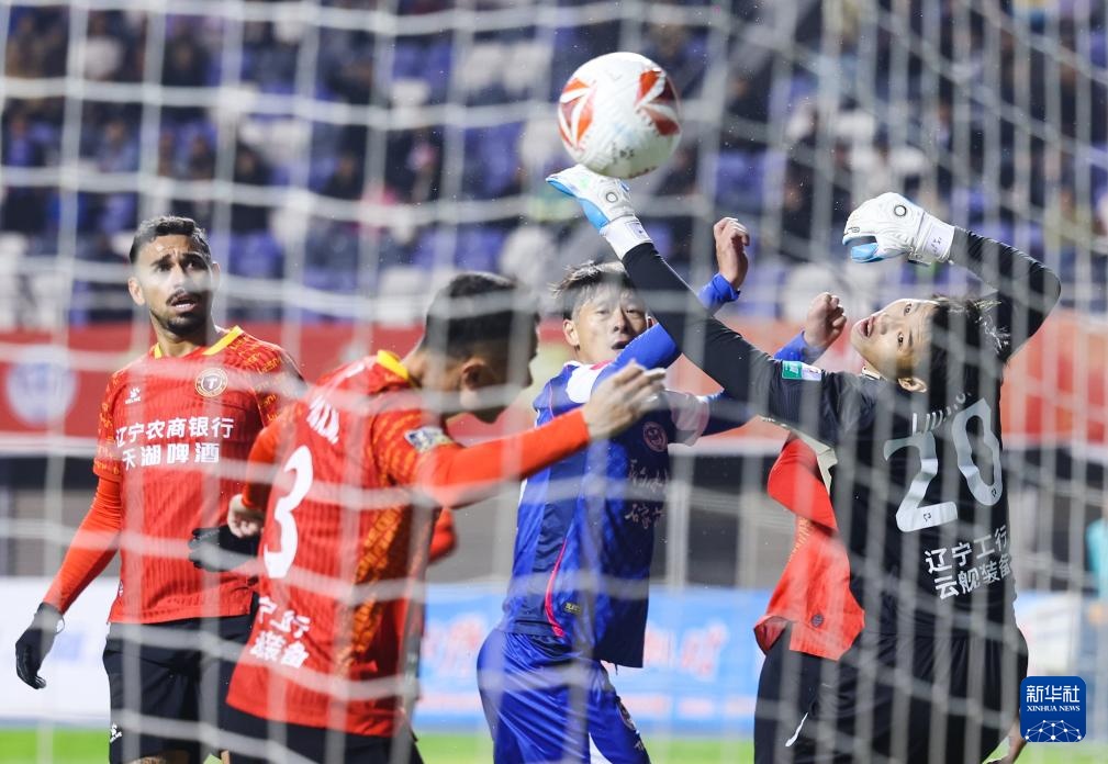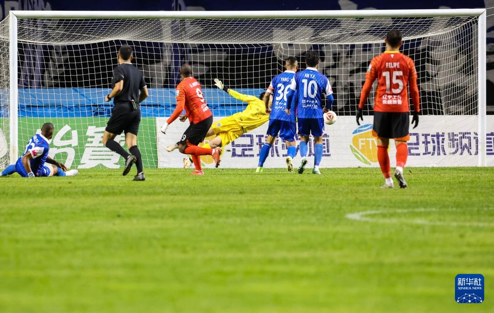 10月11日,遼寧鐵人農商銀行隊球員姆本扎(左三)在比賽中破門。