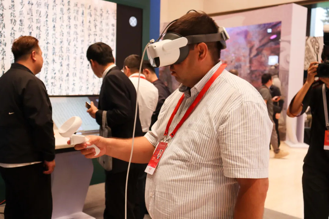 2025年9月17日,陜西西安,2025年世界互聯網大會文化遺產數字化論壇開幕。圖為外籍參會者體驗數字化項目。中新社記者 李一璠 攝