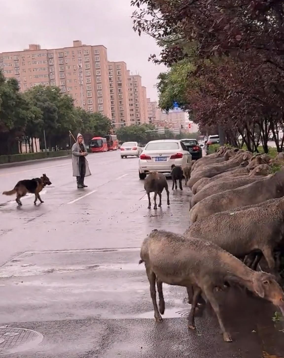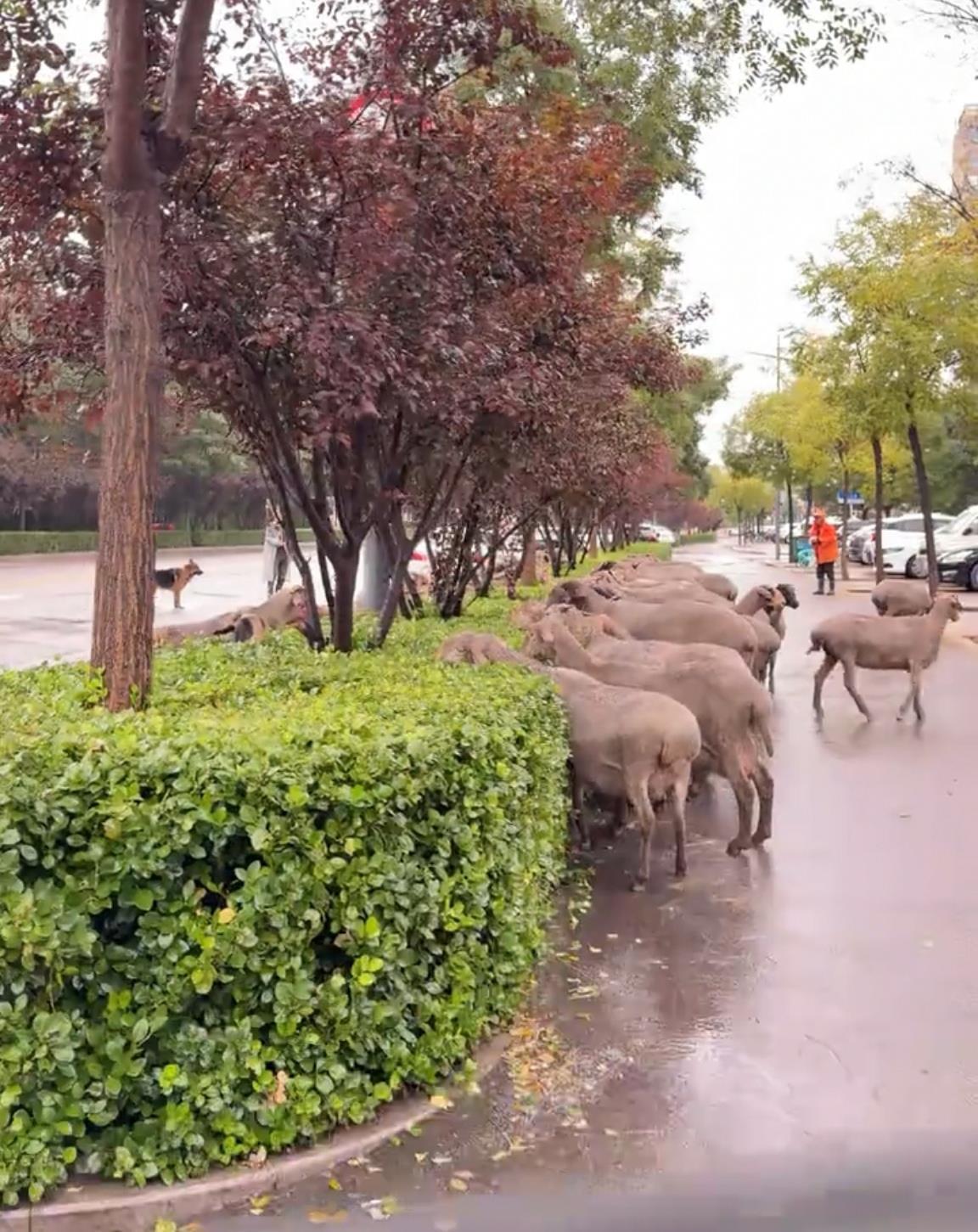 10月11日,有網友發視頻稱“太原城市街頭真神奇,這是怎么了?”視頻顯示,天空中下著小雨,牧羊人穿著雨衣,扛著鞭子,帶著獵狗,站在路中央,看著數十頭羊正圍著綠化帶吃綠葉,綠化帶兩邊車來人往。