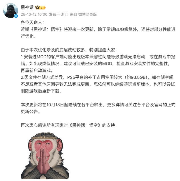 10月12日,@黑神話 宣布,近期《黑神話:悟空》將迎來一次更新,除了常規BUG修復外,還將對部分性能進行優化。