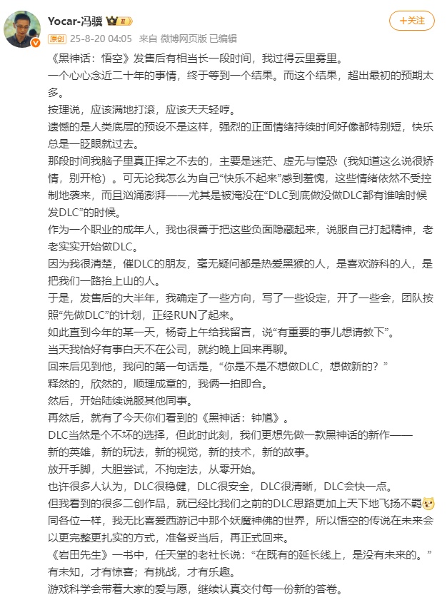 游戲創始人、CEO,《黑神話:悟空》制作人馮驥凌晨發文解釋為何先推出新作《黑神話:鐘馗》,而不是DLC(Downloadable Content,可下載內容)。他表示,《黑神話:悟空》發售后有相當長一段時間,他過得云里霧里。