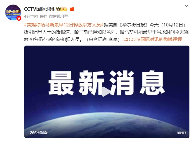 據美國《華爾街日報》今天(10月12日)援引消息人士的話報道,哈馬斯已通知以色列,哈馬斯可能最早于當地時間今天釋放20名仍存活的被扣押人員。