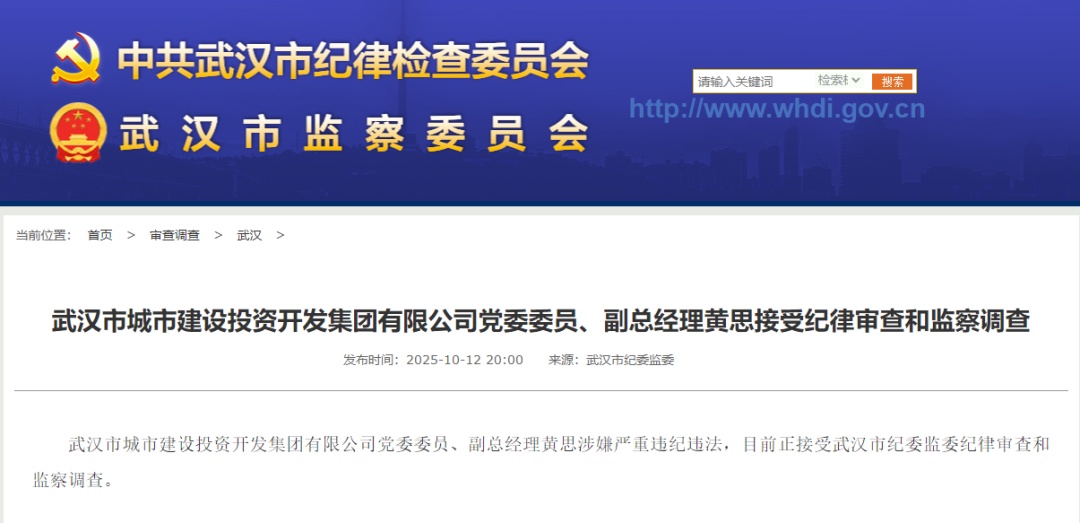 武漢市紀委監委官網10月12日消息:武漢市城市建設投資開發集團有限公司黨委委員、副總經理黃思涉嫌嚴重違紀違法,目前正接受武漢市紀委監委紀律審查和監察調查。