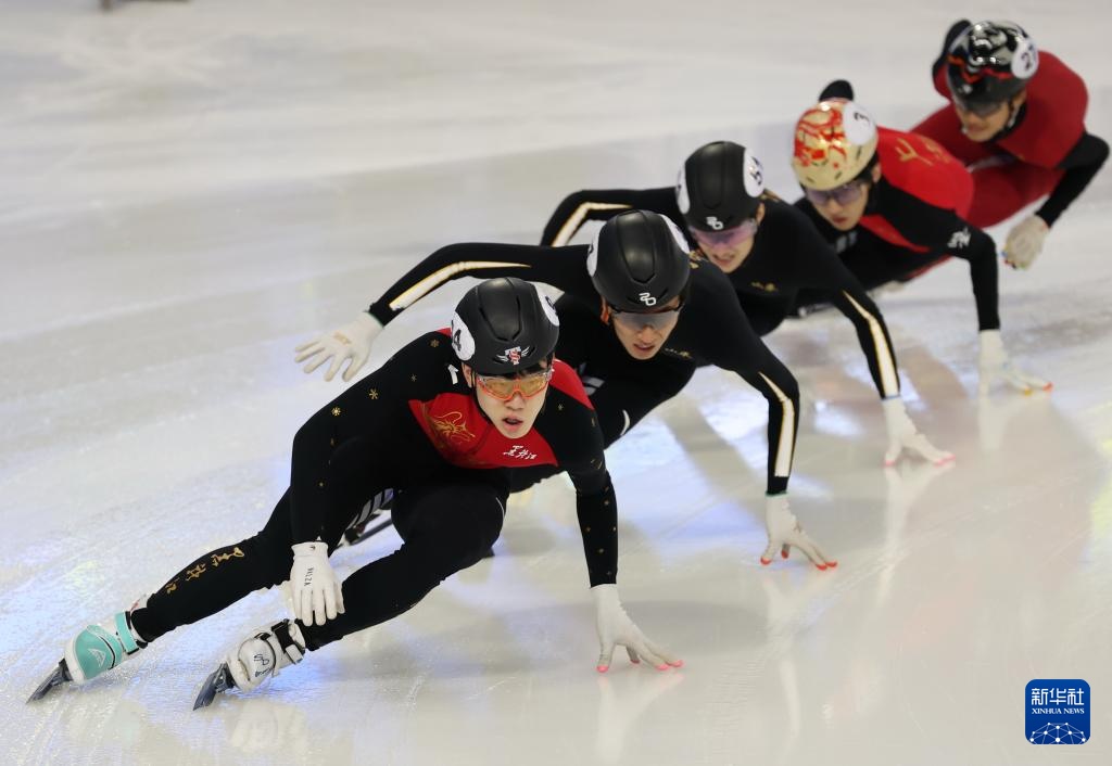 10月12日,黑龍江省冰上訓練中心選手王天佑(左一)在甲組男子1000米決賽中。最終,他奪得冠軍。